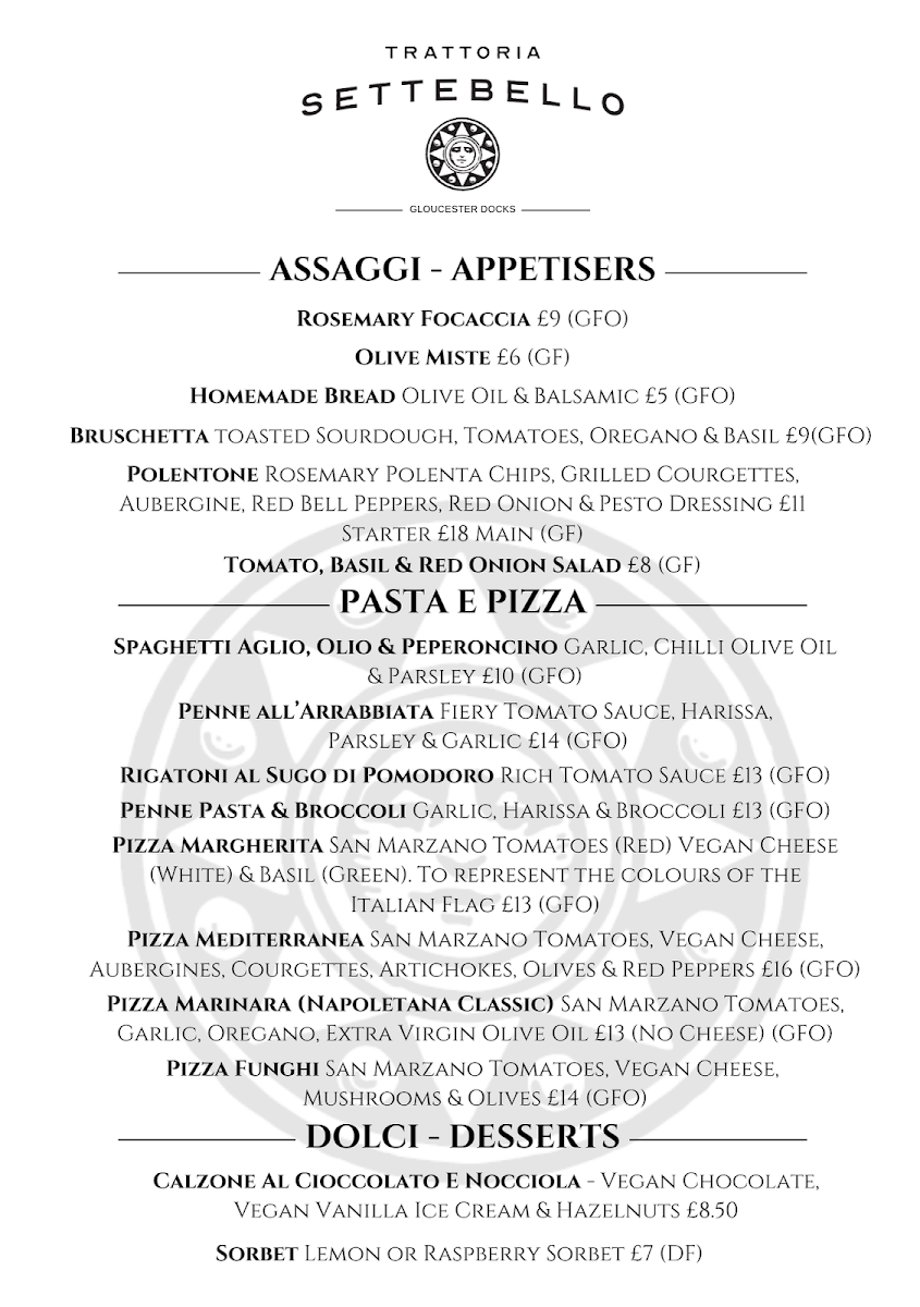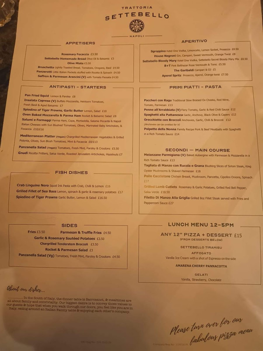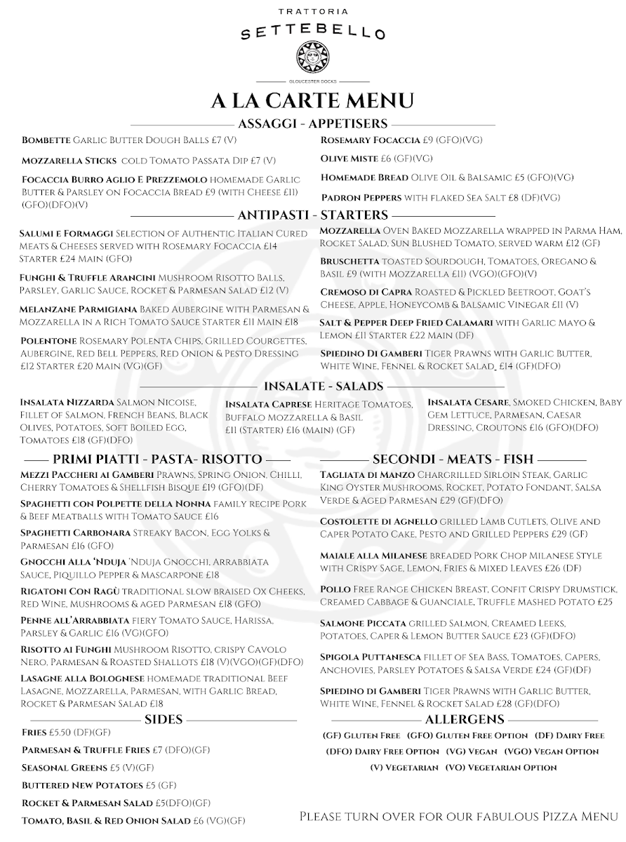 Trattoria Settebello, nestled in the scenic Docks of Gloucester, offers a delightful dive into authentic Italian cuisine, blending traditional recipes with a modern twist. The menu provides a broad selection of Italian classics, expertly crafted to meet a variety of tastes. The restaurant's ambiance, with its stylish yet cozy vibe, complements the food, creating a perfect setting for a relaxed dining experience.